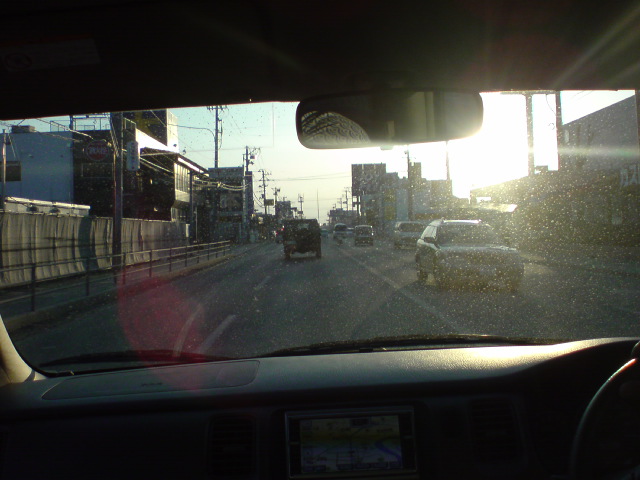 画像は車の中から夕陽。