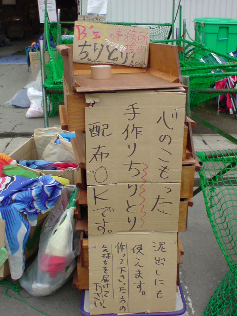 B’zの事務所から寄贈されたという手作りちりとりが積まれてました。