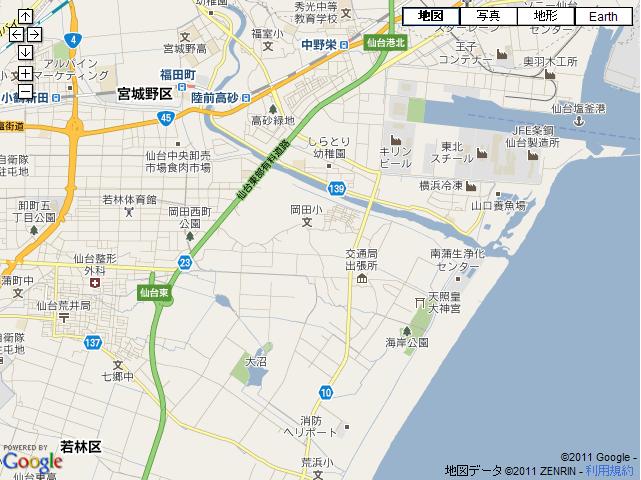 地図の下の方が荒浜で、津波の被害がひどかったところです。