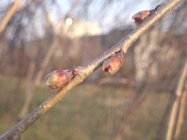 川沿いのしだれ桜並木の枝はまだ固い蕾です。